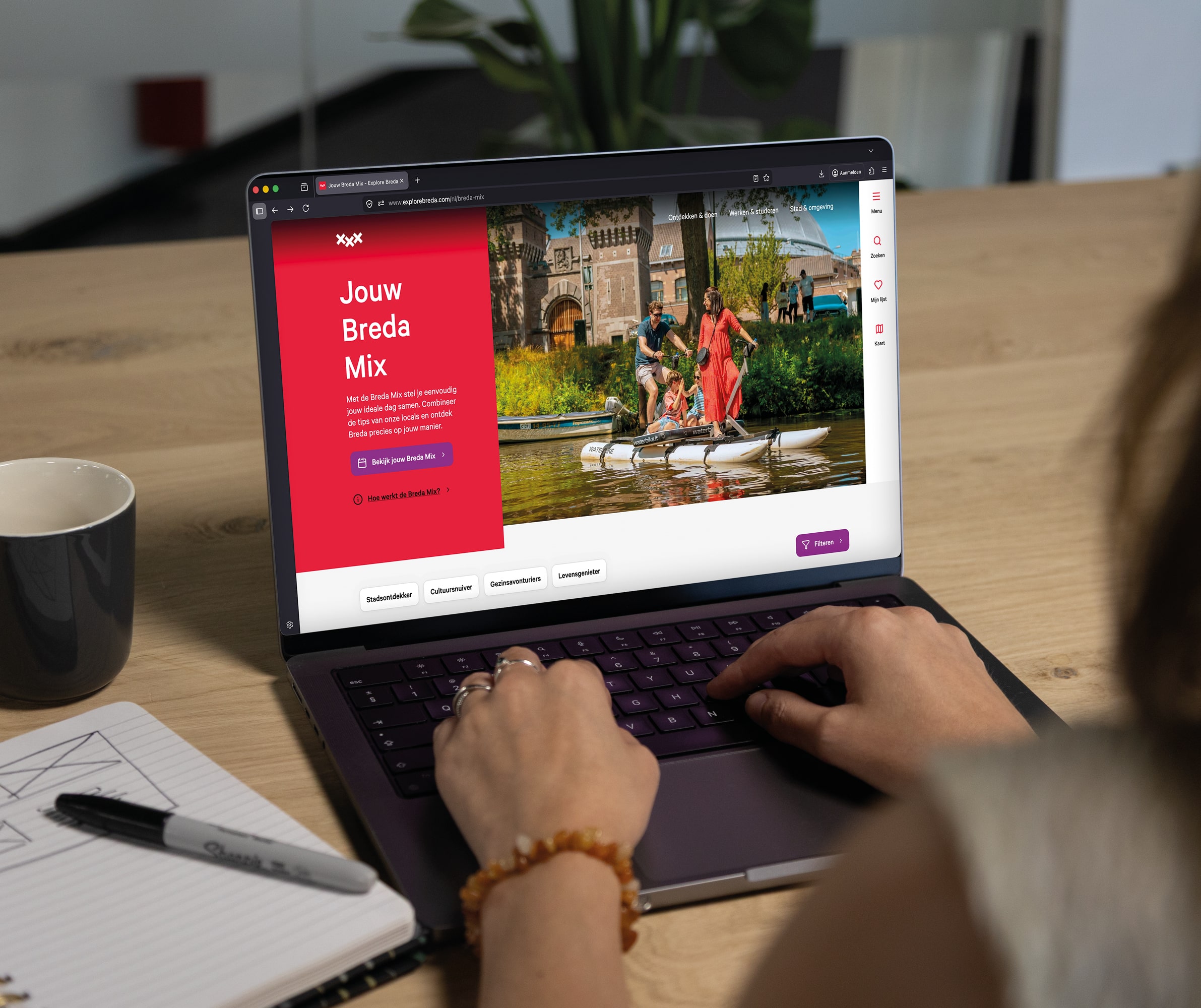 We trapten af met toffe brainstormsessies. Doelstelling was om meer bezoekers langer te laten verblijven in Breda. Wie is de bezoeker van Breda? En wat zoeken zij? Rust? Cultuur? Avontuur? En hoe inspireren we ze? Hieruit ontstonden vier herkenbare locals, ieder met een eigen manier van de stad beleven: De Gezinsavonturier, De Stadsontdekker, De Levensgenieter en de Cultuursnuiver. Per local onderzochten we welke favorieten zij hebben en hoe hun ideale dag Breda eruitziet.
